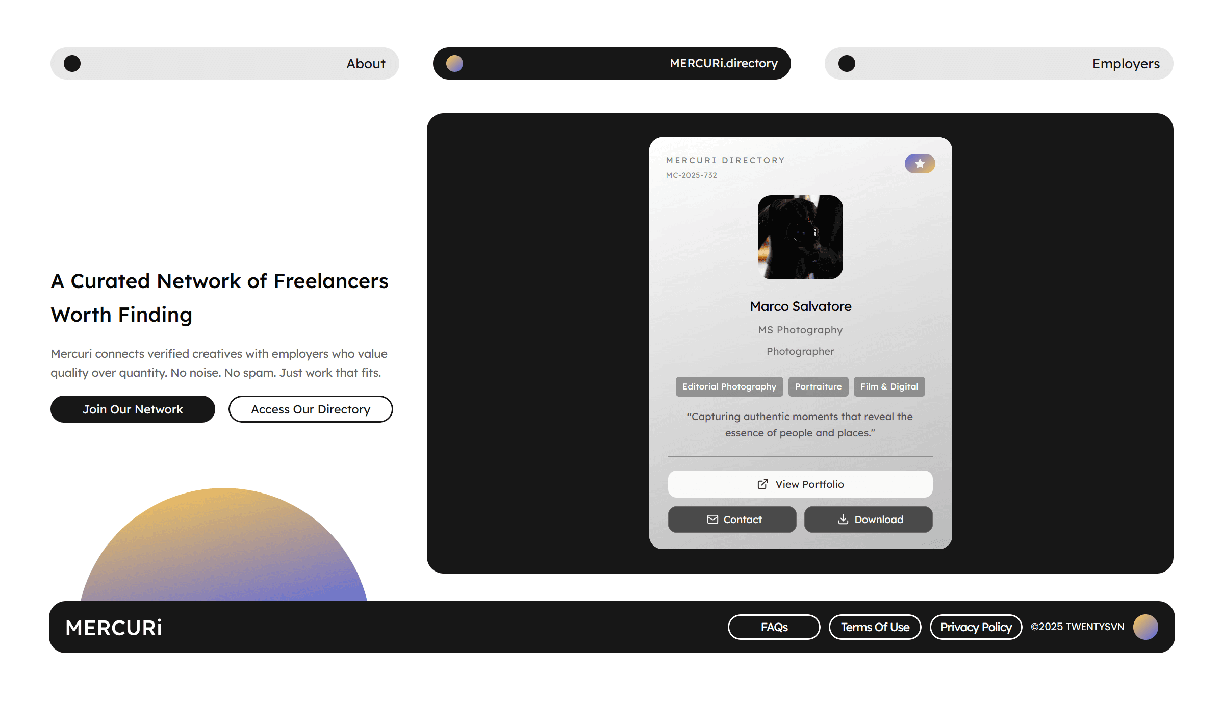 Mercuri is a curated online directory that helps employers discover independent creatives through clean, card-based profiles. It’s designed for freelancers who want to be found without competing in overcrowded marketplaces and for employers who want a quick, credible way to browse talent. The platform solves the problem of visibility and trust in freelance discovery, turning the process from a noisy search into a simple, curated experience.